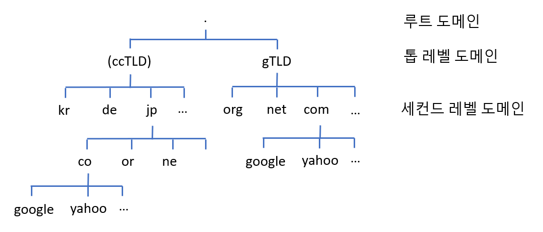 와 같이 2가지의 부분으로 나누는 것이 가능하다. 도메인명은 컴퓨터가 소속되어 있는 네트워크 상의 구역이다. 해당 구역의 안에 컴퓨터에게 붙여 저 있는 고유의 이름이 호스트명이다. 호스트 명의 경우에는 www 뿐만 아니라 www.example.com 등도 가능하다. www.example.com 과같은 생략하지 않은 체 표시한 이름을 FQDN ( Fully Qualified Domain Name : 완전 수식 도메인)이라고 한다. 도메인은 계층 구조로 이러워져 있으며, 그 정점을 루트 도메인이라고 한다.
